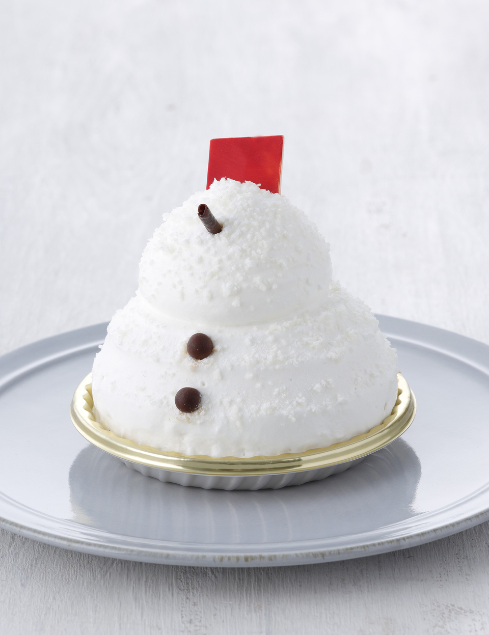 ■商品説明:クリスマスシーズンにぴったりなかわいい雪だるまのケーキ。バニラムースで作ったおいしい雪だるまの中には、ほろ苦いキャラメルでソテーしたバナナ、ミルクチョコにくるみやプラリネを合わせたナッツガナッシュをしのばせている。