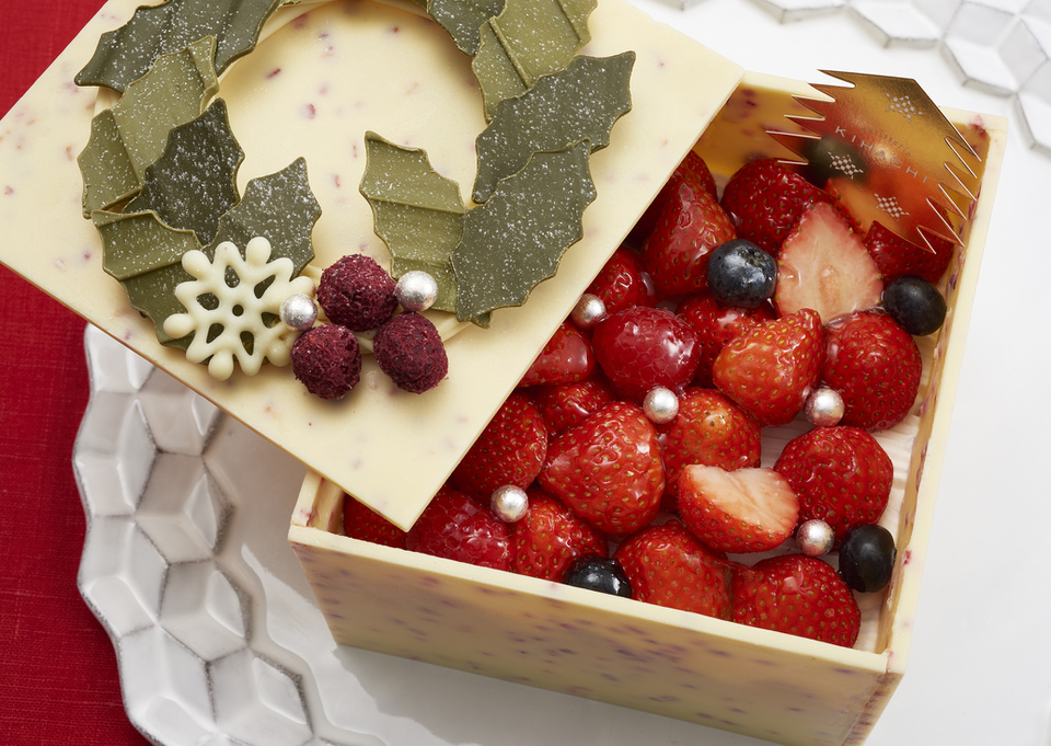 ■商品説明:ホワイトチョコレートの雪の結晶をポイントにした2019年のクリスマスリースを、プレゼントBOXに仕立てたスペシャルケーキに飾りつけた。