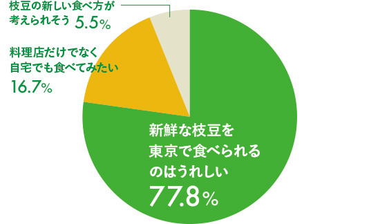 また 約8割の方が「新鮮な枝豆を東京で食べられるのは嬉しい」と回答し、東京都内での「朝採れ枝豆」の提供拡大に向けて消費者の方から好意的なフィードバックが得られた。一般的には枝豆の最盛期は6-9月とされているが、約半数の方が枝豆の旬の時期を知らず、旬の枝豆の美味しさを伝えていく活動の余地を感じさせる結果となった。なお、大館市では複数品種の収穫時期をずらして行うため、最盛期は7-10月と他品種よりも長く10月も提供できるのが特徴だ。