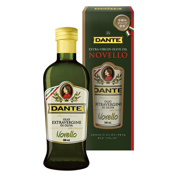 「ノヴェッロ」とは、その年の早摘みのオリーブだけから作られるエキストラバージンオリーブオイルのこと。「ダンテ“ノヴェッロ”」は、イタリア•カンパーニャ州で採れた早摘みのオリーブを使用した希少価値の高い商品だ。「オリーブのフレッシュジュース」とも例えられる、フレッシュでフルーティな香りに加え、ほのかなナッツの香り、喉に感じるオリーブ特有の軽い刺激が特徴である。