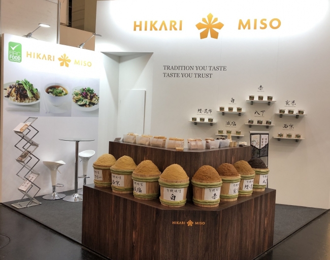 同社ブースでは8種類のオーガニック味噌を樽に盛り付けてディスプレイし、テイスティングだけでなく、昔ながらの味噌の量り売りを演出する。オーガニック•和食•発酵食をキーワードに、日本の伝統食品“味噌”の魅力を発信する。