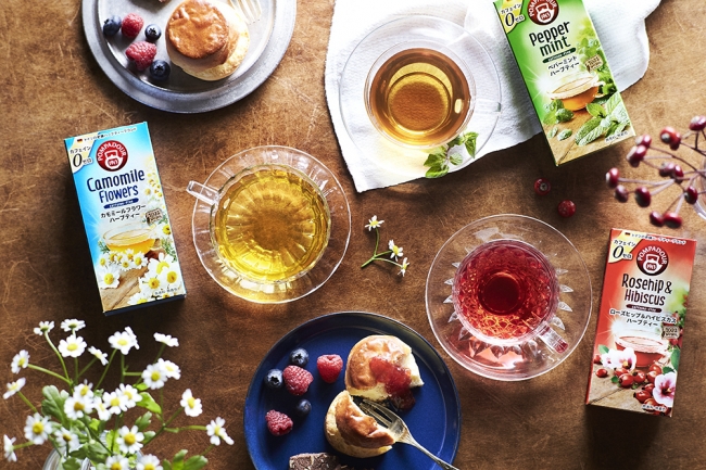 ルビーレッド色の「ストロベリー&オレンジ」、明るいオレンジ色の「ピーチ&パッションフルーツ」に今回発売のパープルレッド色の「ベリーモヒート」が加わり、全3種類のラインアップとなった。ぞれぞれのハーブティーの色は、ハーブやフルーツの自然な色から生まれていて、着色料を使用していないのも特徴だ。