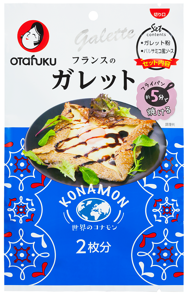 第2弾はフランスの「ガレット」とイタリアの「ピッツァ」。どちらもこねたり寝かせたりする必要なく、粉と水を溶くだけで生地をつくることができる。生地をフライパンに薄く広げ、具材をのせて焼くだけの5分間の簡単調理で、本格的な手づくりガレットとピッツァが完成。様々な具材のアレンジで、自分好みの世界のコナモンをお楽しみいただける。