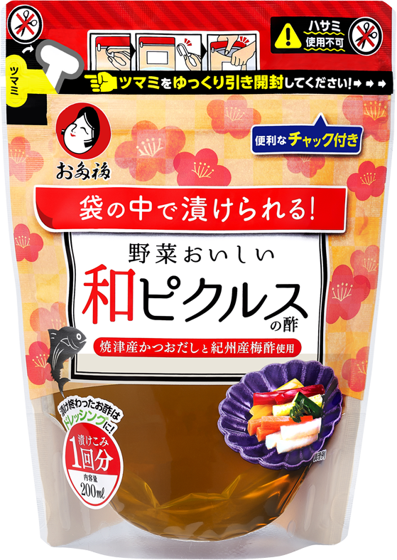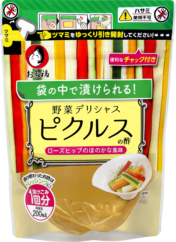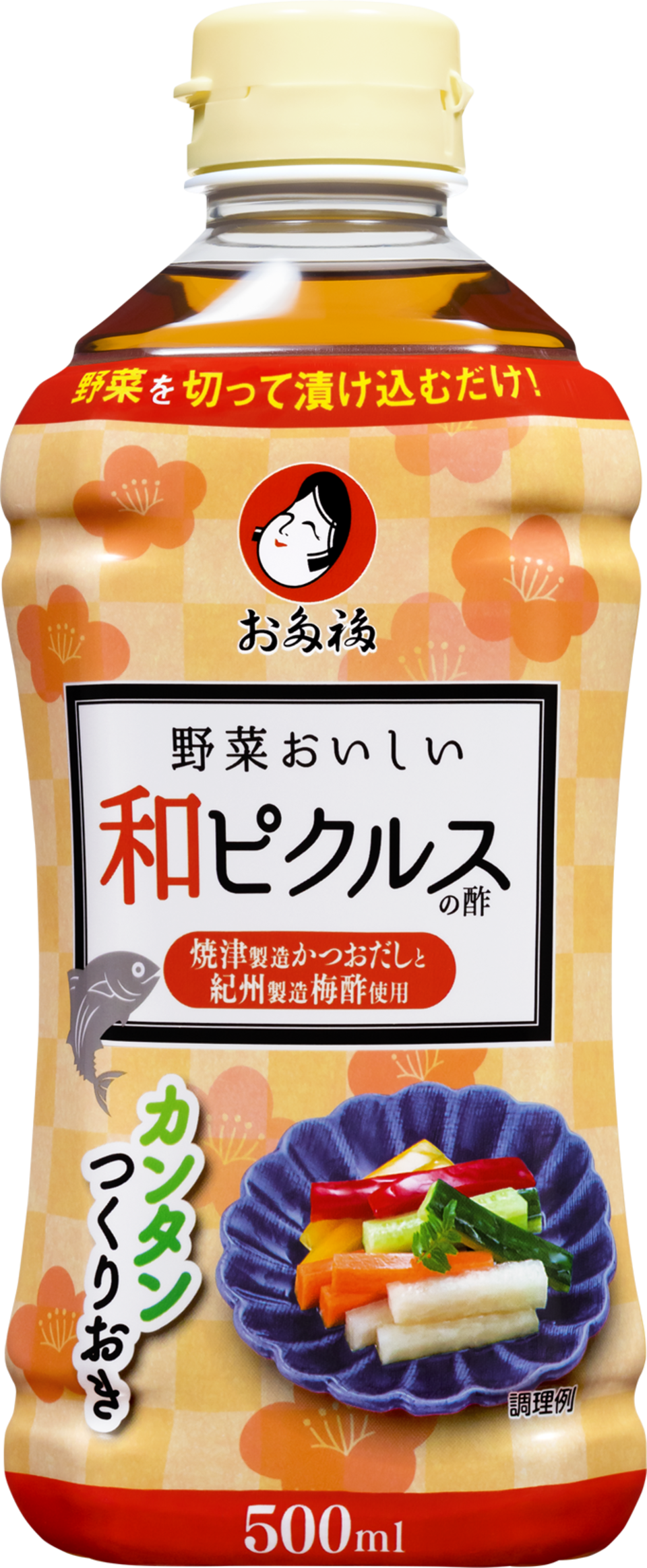 2017年7月に発売した「和ピクルスの酢チャック付」は、切った野菜を袋の中で漬けられる簡便さと、かつおだし•梅酢の和風味が好評。この度「漬ける量を調節したい」とのお客様の声を受け、ボトルタイプが登場した。シリーズ品の「ピクルスの酢」とともに、手軽に野菜を摂取できるつくり置きの1品にお役立ていただける。