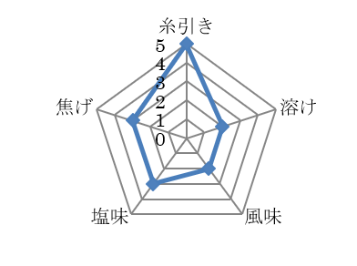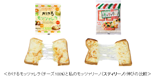 そこで今までにない「捏ねる」という工程を加える等、試行錯誤を重ねた結果、よく伸びるチーズ代替品「コレステロール95%オフ 私のモッツァリーノシュレッド300g」が完成した。よく加熱することで伸び、さらに一度冷めた後も再加熱することで再度伸びが見られる。