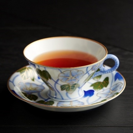 (左)20世紀初頭、英国の貴婦人が紅茶を嗜んだ朝顔意匠を復刻した「染錦つる朝顔 紅茶碗皿」は、爽やかなモーニングに相応しい器。伝統技が表現する繊細なブルーの朝顔とグリーンのアラベスク(唐草)の風合いが優しくも華やかなティーカップを、シンプルながらもカタチ愛らしい器と合わせた。