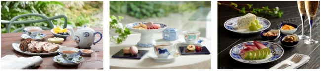 (中央)深川の上質な白磁とブルーの器を用いることで、いつものティータイムが上質な時間へと変わる。店内でも使用する「瑠璃 陶板」は、美しい瑠璃色が和にも洋にも合う使い勝手のいい器だ。