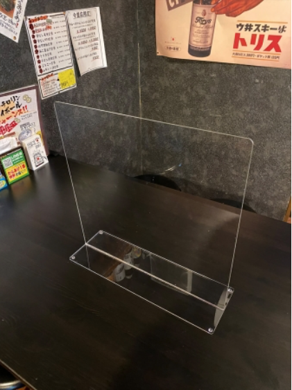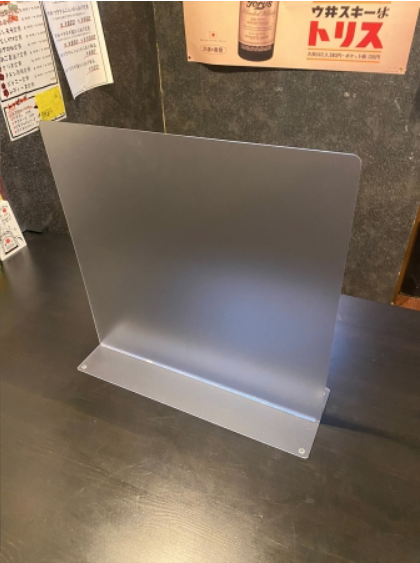 飲食店でのカウンター、テーブル席で安心してお食事ができる簡易パーテーションだ。透明または半透明のアクリル製で、置くだけ簡単、工事不要のため客数に応じて調整可能、「おひとり様席」が簡単に、客と板前の間にも、T型で程よい高さもあり倒れにくい、オフィス、ホテル受付カウンター等、様々な所で安心してプライバシーを守れる。