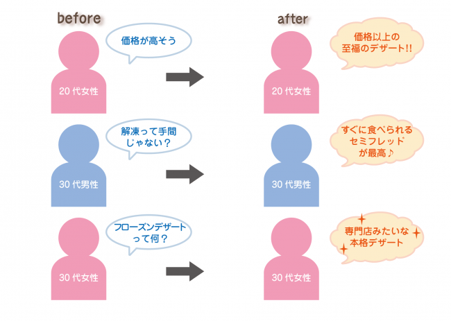 半解凍で『サクッ』しばらく置いて『トロッ』レンジで温め『ジュワ~、トロ~』。温度により変化する風味と食感は『食べる楽しさ』を与えてくれる。1つの商品で何通りも楽しめるのは、フローズンデザートならではのお楽しみだ。