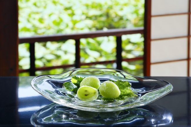 「宗家 源 吉兆庵」 果実菓子“自然シリーズ”人気No.1 『陸乃宝珠(りくのほうじゅ)』販売開始、岡山県産の マスカット・オブ・アレキサンドリアをまるごとひとつ使用 |