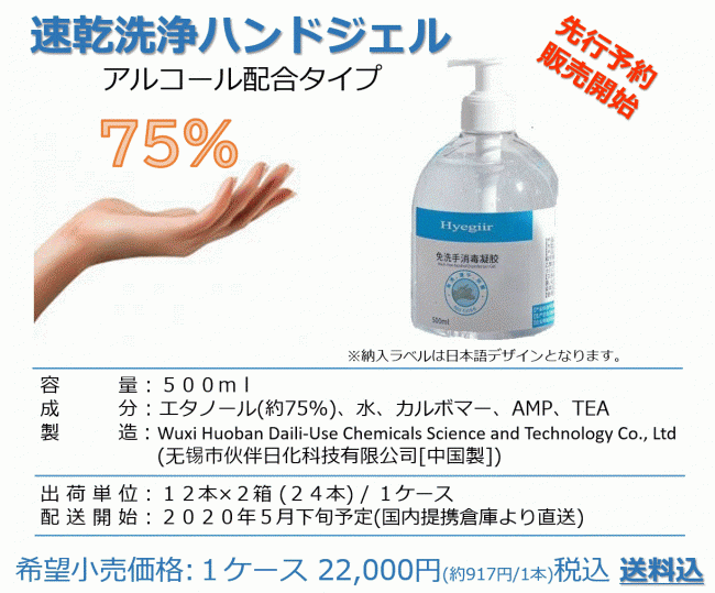 メディカルツーリズム•ジャパン(株)(坂上勝也代表取締役)メディカルリスクマネジメント事業部は、新型コロナ対策向けとして「アルコール75% 速乾洗浄ハンドジェル」の発売を発表した。新型コロナ発生以降、中国からの供給価格が高騰している中、自社の上海事務所•既存取引関係の独自ルートの交渉などにより市場価格よりも低価格での販売を実現した。