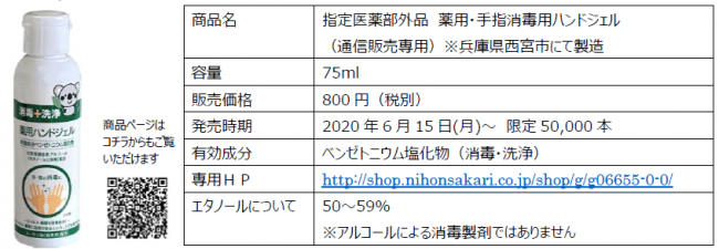 日本盛(株)(本社兵庫県西宮市、森本直樹代表取締役)は、「薬用•手指消毒用ハンドジェル」を6月15日(月)より追加で50,000本販売する。