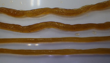 特許「ちぢれ風製法」により製造した糸こんにやく(上)と通常の糸こんにゃく(下)