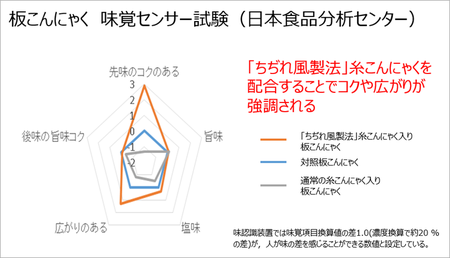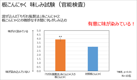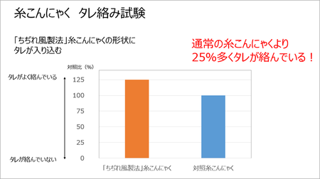 さらに「ちぢれ風製法」により製造した糸こんにゃくを細かく刻んで板こんにゃくに40%配合し、タレで味付けして通常の板こんにゃくとの比較を行った。味覚センサーでの分析によると、特に「コクのある味わい」「味わいの広がり」が強調されることがわかった。同時に「ちぢれ風製法」による糸こんにゃくを配合した板こんにゃくは、官能検査でも通常の板こんにゃくと比較して有意に味の染み込みが良くなることを確認した。