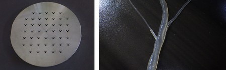 糸こんにゃく成型のために穴の大きさや配置を工夫した目皿(左)、太さの異なる3本のこんにゃくを絡めて成型(右)