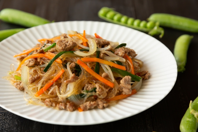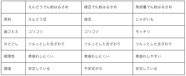 同じ豆系のでん粉を使った緑豆はるさめと同等の食感で、コシが強くなめらかな食感だ。