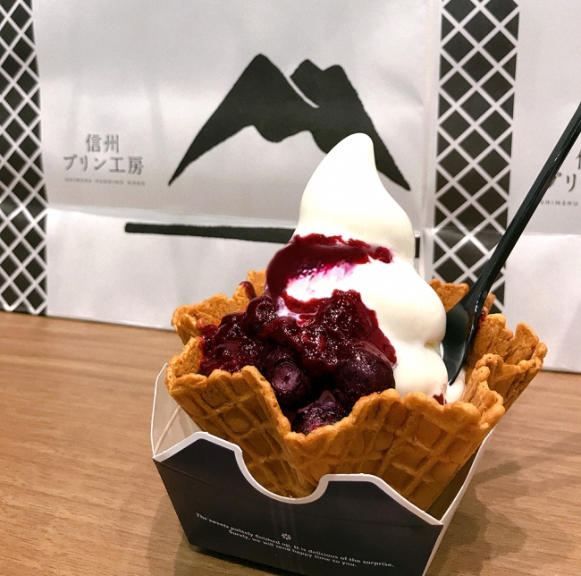 (株)スドージャム(松本市笹賀、須藤尚孝代表取締役)は、本社のある長野県松本市中町通りに昨年オープンしたプリン専門店「信州プリン工房」にて、信州産ブルーベリーを使用したソフトクリームをGOTOトラベルキャンペーンが始まる7月23日より販売する。