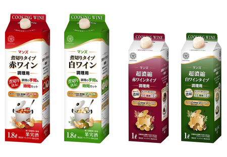 「マンズ•煮切りタイプワイン調理用」シリーズ、「マンズ•超濃縮ワインタイプ調理用」シリーズともに環境にやさしい紙パック入りだ。いずれも濃縮タイプなので在庫スペースも削減できる。同社はこれからも社会の変化に応じて、お客様のニーズに合わせた商品の開発に取り組んで行く。1.品名及び容量•容器•荷姿