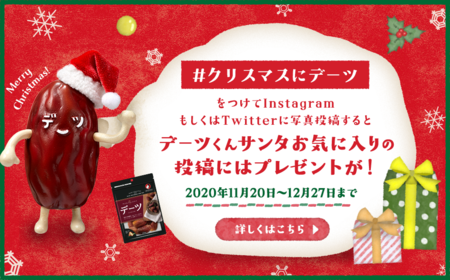 <応募方法>デーツくん[オタフクのデーツ公式]のtwitterアカウント「@dates_kun」若しくはInstagramアカウント「@dates.kun」をフォローし、ハッシュタグ「#クリスマスにデーツ」をつけて、皆さんの周りにあるデーツの写真を投稿。