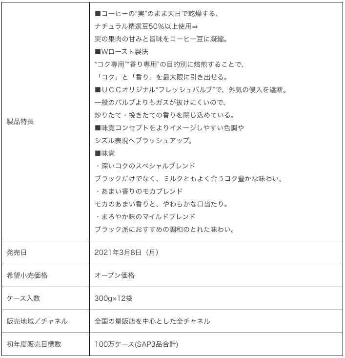 『UCC 職人の珈琲 SAP300g』シリーズと『UCC 職人の珈琲 ドリップコーヒー18P、30P、50P』シリーズは、コーヒーを“実”のまま天日で乾燥する、ナチュラル精製豆を50%以上使用し、コーヒーの実の果肉の甘みと旨味をコーヒー豆に凝縮している。さらに「コク」と「香り」を最大限に引き出すために、“コク専用”“香り専用”の目的別に焙煎する「Wロースト製法※1」を採用することで、上質なコクと芳醇な香りを実現している。