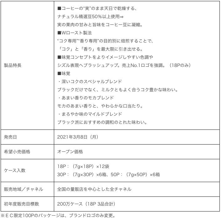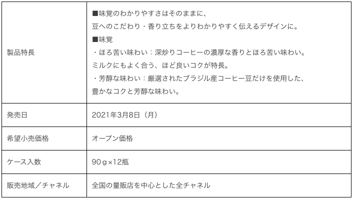 味のイメージがつきやすいと好評の現行品の味覚表現については変更せず、消費者が購入する際に味覚選びの基準とする「苦味」「酸味」「コク」の3つの要素を味覚チャートで一目でわかりやすく、継続してパッケージ正面の目立つところに配置している。