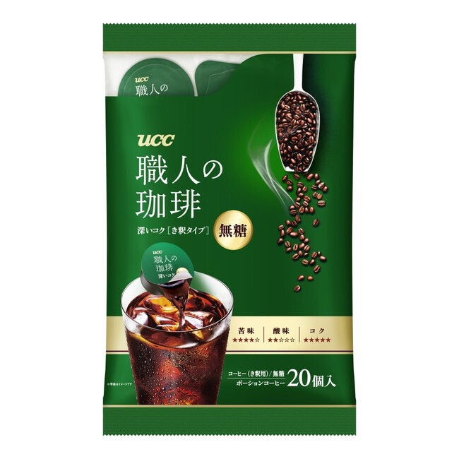 こうした消費者動向を踏まえ、UCCはコーヒー専業メーカーとして、手軽なだけでなく、本格的なコーヒーを一人分から味わえる製品として、希釈タイプ『UCC 職人の珈琲 ポーションコーヒー 深いコク 無糖き釈用 20P』を新発売する。香料不使用でミルクにもよく合う深いコクと香ばしい香りが特長だ。アイスでもホットでもお楽しみいただけ、さらにおうち時間を充実させる、お菓子作りやアレンジレシピにも活用いただける。