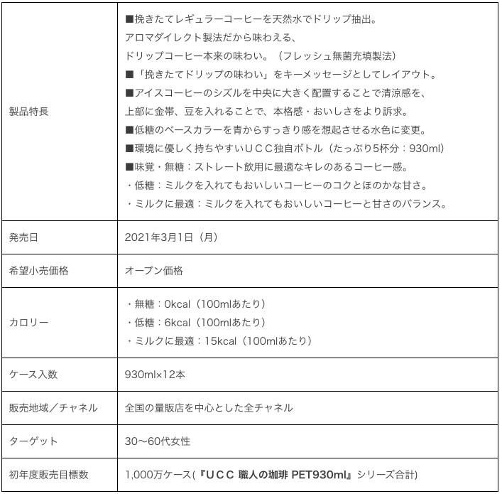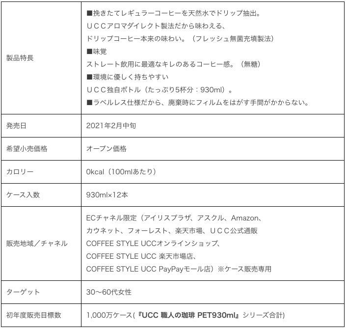 この度刷新したブランドロゴをレイアウトするとともに、“清涼感”“本格感”をよりイメージしやすいデザインにリニューアルした。さらに新型コロナウイルスの影響による在宅時間の増加、巣ごもり消費を追い風に、まとめ買いやケース購入が増えたことにより、処分時にラベルをはがす手間が省けること、またゴミが少なく環境負荷の低減につながることから、ペットボトル飲料の商品ラベルがない「ラベルレス」の需要が高まっていまることを受け、『UCC 職人の珈琲 無糖 PET930ml』のラベルレス製品を2月中旬から一部のECチャネル限定で展開する。