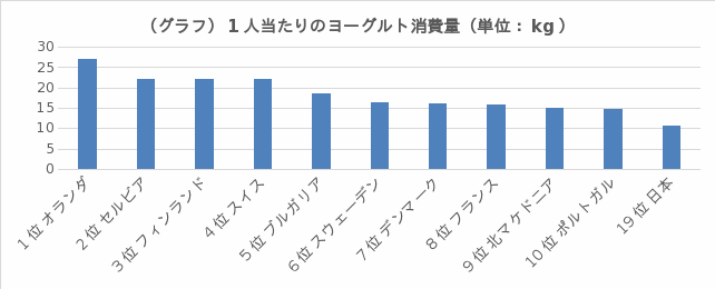 2019年の世界各国における一人当たりのヨーグルトの消費量のランキングは、1位のオランダを筆頭に、欧州諸国が上位を占めている(グラフ)。日本は19位で欧州諸国に比べるとまだまだ消費量拡大の余地があるといえる。