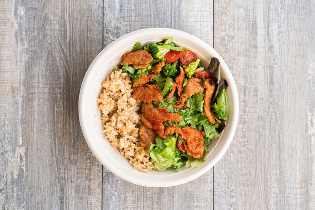 サラダに玄米が入ったシリーズ「GOHAN」の新メニュー。100%植物性のお肉「フェイクミート」(代替肉)を使った韓国風のピリ辛ヴィーガンサラダ一般的な焼肉と比べると脂質が半分以下でタンパク質は約2倍だ。