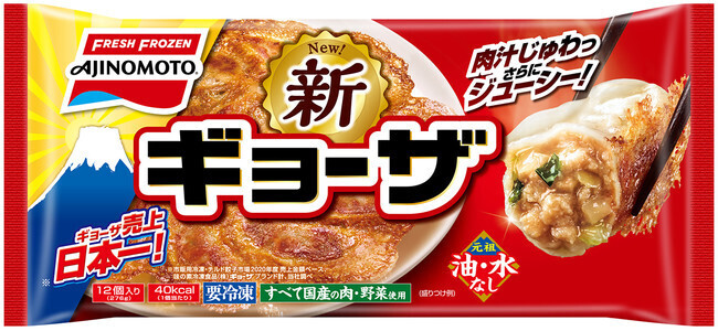 1972年の発売以降、“永久改良”を続けているギョーザ売上日本一※の「ギョーザ」は、生活者がより自信を持って食卓に出していただけるよう、さらにおいしくリニューアルします(※市販用冷凍•チルド餃子市場2020年度売上金額ベース、味の素冷凍食品(株)ギョーザブランド計、同社調べ)。油•水なしでパリッパリの羽根ができる「ギョーザ」は、薄皮パリッとジューシーで具がギュッとつまった王道の味のギョーザだ。この度のリニューアルでは、豚肉を約1.5倍※に増量し、原料の配合や中具の練り方を工夫することで、噛むたびに中具から肉汁がじゅわっと溢れだす、更にジューシーな味わいになった(※当社従来品比)。また素材本来のおいしさを感じるレシピに変更したことで、よりごはんに合う、食べ飽きない味に大幅に進化した。
