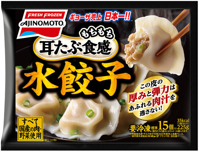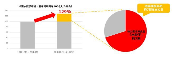 もちもち耳たぶ食感の「水餃子」を発売した2020年秋季以降、冷凍水餃子市場は前年同期比約129%※と拡大し、その伸長額の約7割※が同社「水餃子」で市場を牽引した(※2019年10月~2020年3月/2020年10月~2021年3月比、100人当たり購入金額ベース、同社調べ)。