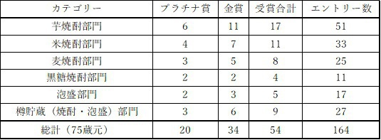 【本格焼酎・泡盛コンクール カテゴリー別受賞数】