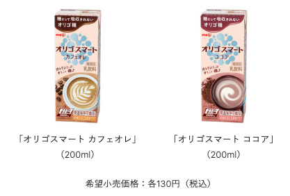 (株)明治(松田克也代表取締役社長)は、糖として吸収されないオリゴ糖である“フラクトオリゴ糖”を配合した「オリゴスマート」シリーズより、シリーズ初となる飲料タイプの「オリゴスマート カフェオレ」と「オリゴスマート ココア」を、9月28日から全国で発売する。希望小売価格は各130円(税込)だ。