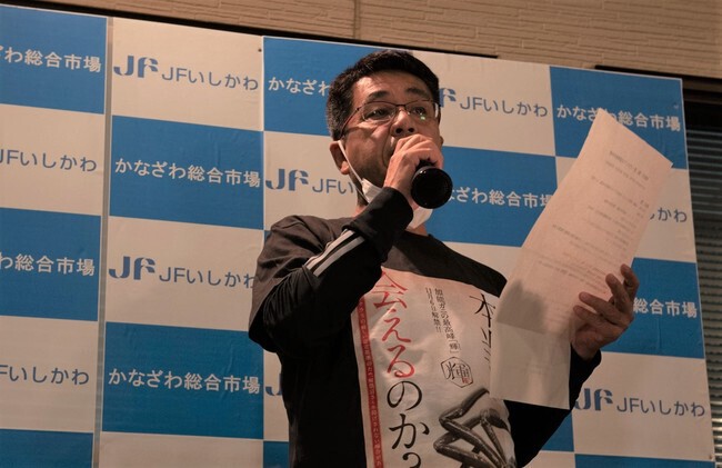 かなざわ総合市場では、石川県漁業協同組合の福平伸一郎常務理事より、加能ガニ「輝」のブランド立ち上げに至った経緯や、ブランドとしての役目、「輝」にかける漁業者への想いを発表。「数年前からブランドの立ち上げを構想しており、今年、県内全域の底びき網漁業者で組織する県底曳網漁業連合会を発足した。度重なる話し合いが行われようやく実現した。加能ガニというブランドを、県下で一丸となって盛り上げ、知名度を全国的に高めていきたい。「輝」がその牽引役になるようにしたい」とコメントした。