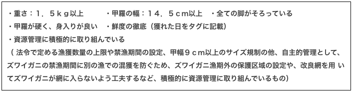・重さ:1.5kg以上・甲羅の幅:14.5cm以上・全ての脚がそろっている・甲羅が硬く、身入りが良い・鮮度の徹底(獲れた日をタグに記載)・資源管理に積極的に取り組んでいる(法令で定める漁獲数量の上限や禁漁期間の設定、甲幅9cm以上のサイズ規制の他、自主的管理としてズワイガニの禁漁期間に別の漁での混獲を防ぐため、ズワイガニ漁期外の保護区域の設定や改良網を用いてズワイガニが網に入らないよう工夫するなど、積極的に資源管理に取り組んでいるもの)