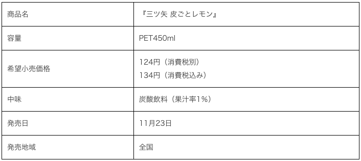 アサヒ飲料(株)(本社東京、米女太一社長)は、『三ツ矢 皮ごとレモン』PET450mlを11月23日より期間限定で全国発売する。