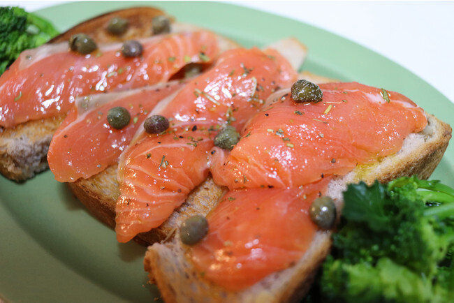 ・いつもの魚をグレードアップする例 鮭のオープンサンド焼きレタス柚子とともにトーストしたパンに、EXうしまどでドレッシングした鮭、ケッパーをのせて。行きつけのスーパーの刺身は厚切りなのでボリューム満点でしたが、薄切りの方が食べやすいかもしれない。”つま”でタルタル風のディップを作り後のせたがよく合う。