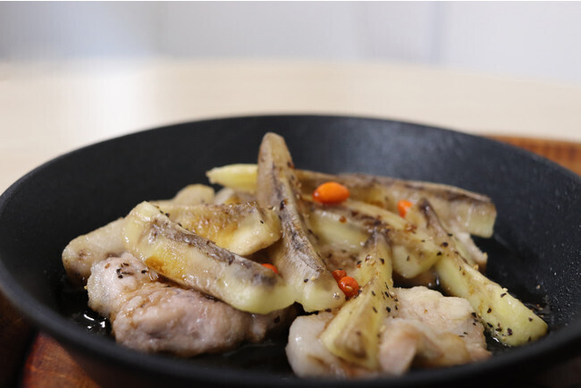 このEXの特徴的なバナナの風味を生かすレシピ。豚肉をスキレットでローストし、追いかけてバナナも載せて火を通す。頃合いに焼けたら、EXうしまどとバルサミコ酢をかける。赤い実は枸杞の実である。