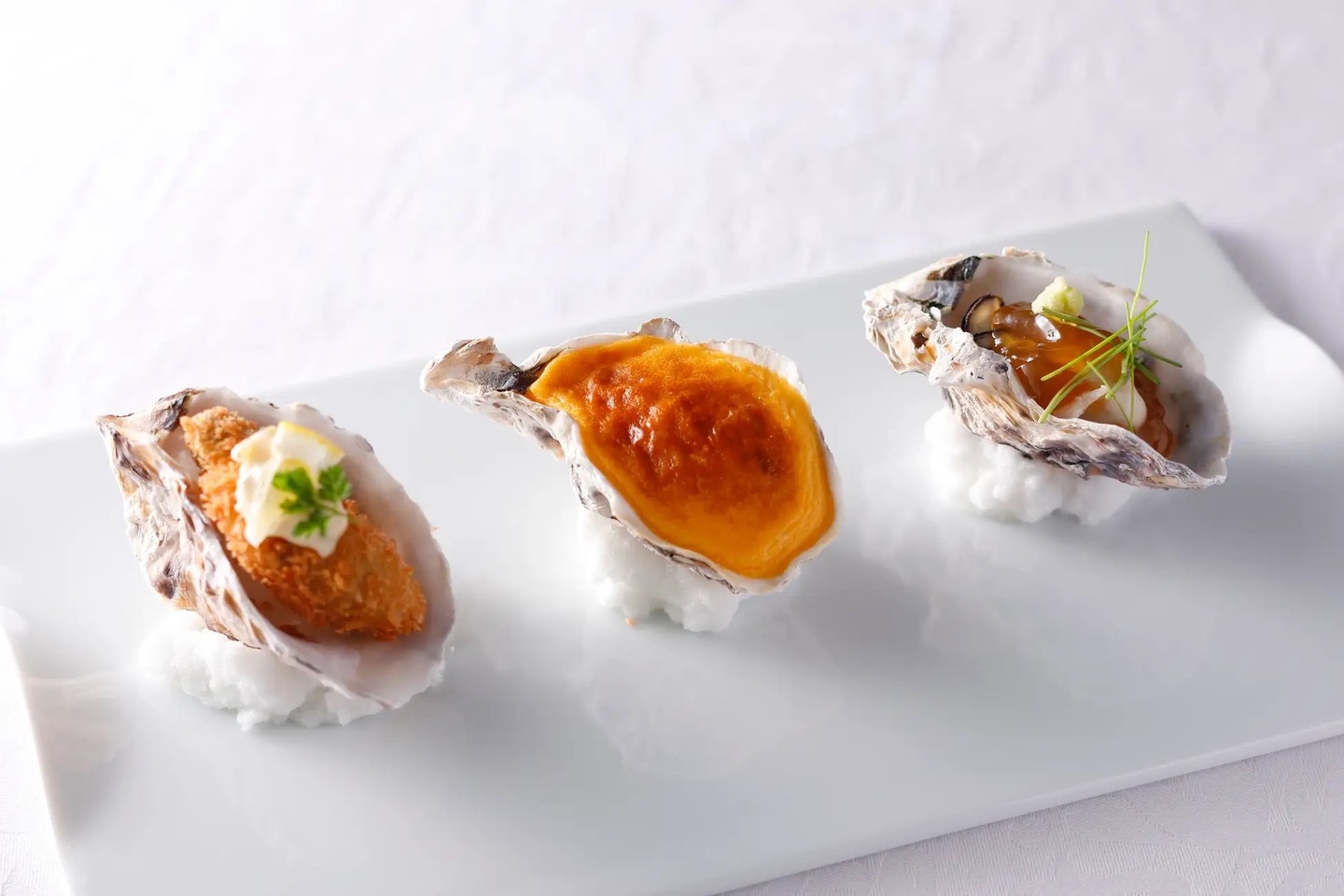 前菜の『福岡県糸島産“ミルク牡蠣” 食べくらべ』では、グラタン、フライ、土佐酢のカクテルの3種類の味わいで旬の牡蠣を贅沢にお楽しみいただける。