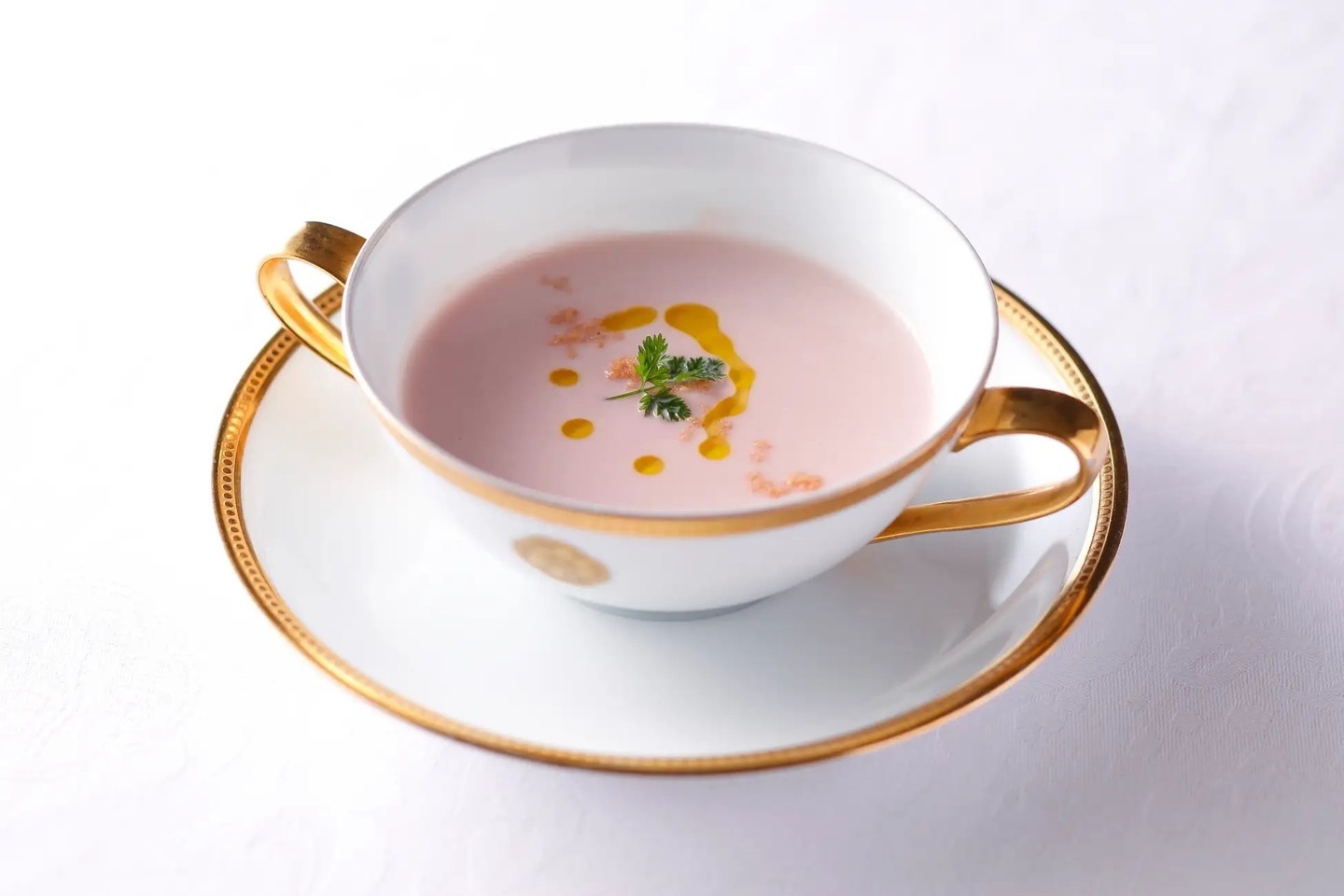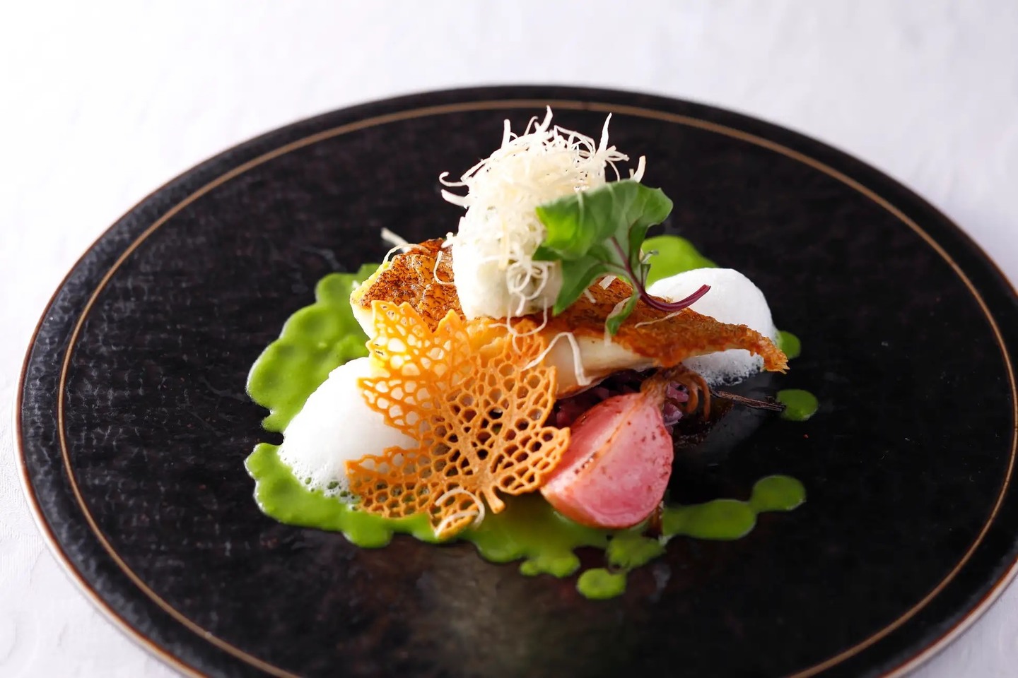 魚料理の『長崎県産キジハタのポワレと黒米のリゾット キジハタ出汁の春菊ソース』は、サクサクとした食感の自然薯のフリットや、丹波ラディッシュなどの付け合わせも存分にお楽しみいただける。シェフが厳選した長崎県産のキジハタの旨味を、ポワレやソースで余すことなくご堪能下さい。