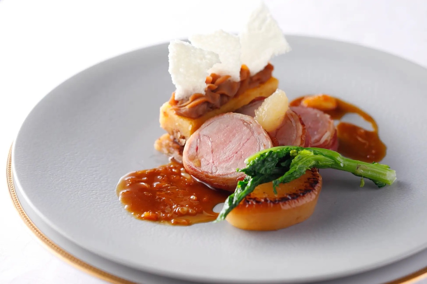 肉料理の『茨城県産“常陸の輝き”豚フィレ肉のベーコン巻き 晩白柚ソース』では、“常陸の輝き”にほのかな甘味と酸味のある晩白柚ソースを合わせた。栗とフランボワーズで仕立てたマロンタルトを添えている。