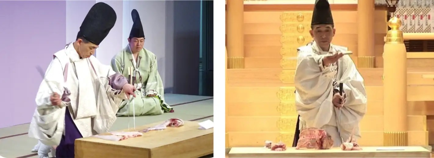 「式庖丁」は、平安時代から宮中で節会などのおめでたい日に行われてきた「食の儀式」。このような形が出来上がったのは、平安時代中期以降すなわち藤原道長、頼道の時代の様式で公家風だ。烏帽子に袴、狩衣姿という当時の衣装を身にまとい、大きな俎板にのせた魚や鳥を直接手を触れずに、庖丁刀とまな箸で切り分け、おめでたい形を表す技でその流儀のひとつが生間(いかま)流式庖丁だ。生間流は1100年以上も脈々と引き継がれ、今回のステージでは現在30代目家元である生間正保氏が、その技をご披露する。