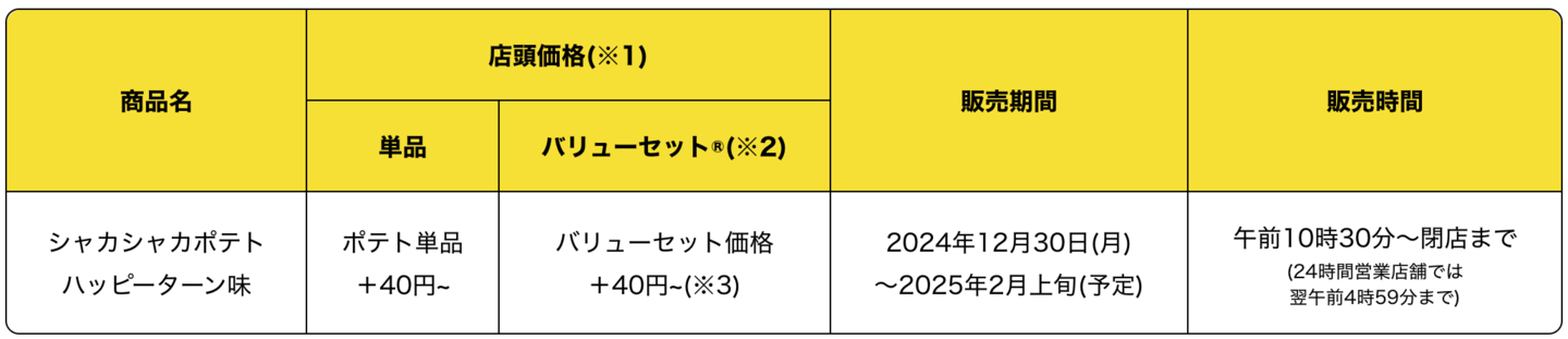 ・※3 バリューセットに+40円~の追加で、サイドメニュー「シャカシャカポテト ハッピーターン味」をお選びいただける。
