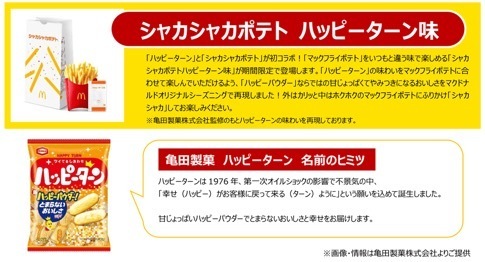 「シャカシャカポテト ハッピーターン味」は、亀田製菓(株)の人気商品である「ハッピーターン」の味わいをマクドナルドの大人気商品であるマックフライポテトで再現した。たくさんのファンに愛されているあの“甘じょっぱいしあわせ”な味わいを、今回はシャカシャカポテトで楽しめる、夢のコラボレーションとなっている。